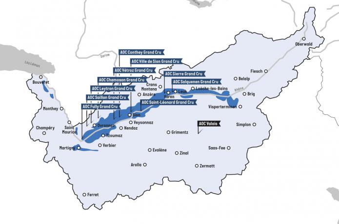 Located in the southwestern region of Switzerland, mostly lying in the Alps. Receiving its water source from the Rhône glacier in eastern Valais, most of the region's vineyards can be found along the slopes of the Rhône river banks. over 62 miles long with terraces ranging from 270m to 1100m above sea level.